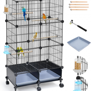 Hanging Bird Cage with Wooden Perches, Double Stackable Metal Cage with Pull Out Tray Standing Birdcage Bird Aviary Indoor with Multi Door Design for a Canary Finch Black