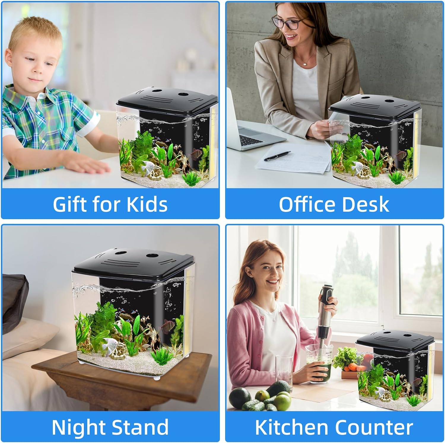 - Compact Size: The tank is lightweight, cute and small and it doesn’t take up too much space on the desktop or a kitchen counter. (Note: If the current is a bit strong, you can put a pre-filter sponge filter on the intake to reduce the water flow.)